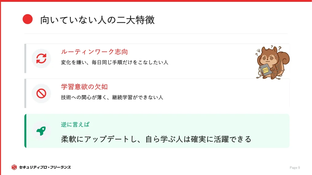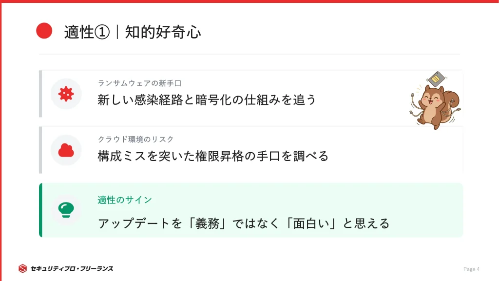 この仕事で生き残るには、最新の脅威や技術を自発的にキャッチアップする知的好奇心が絶対に必要です。