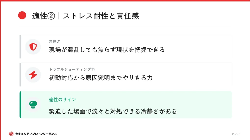 情報資産を守る重責を担うため、プレッシャーに負けないストレス耐性と責任感が求められます。