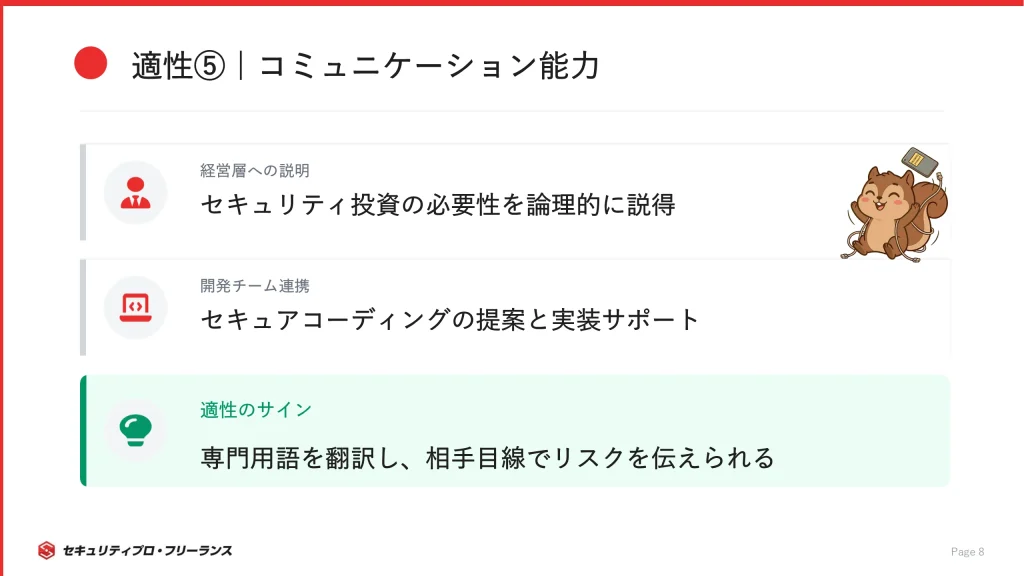 専門用語を並べるのではなく、相手のIT知識に合わせてリスクや対策を翻訳して伝えるスキルが求められます。