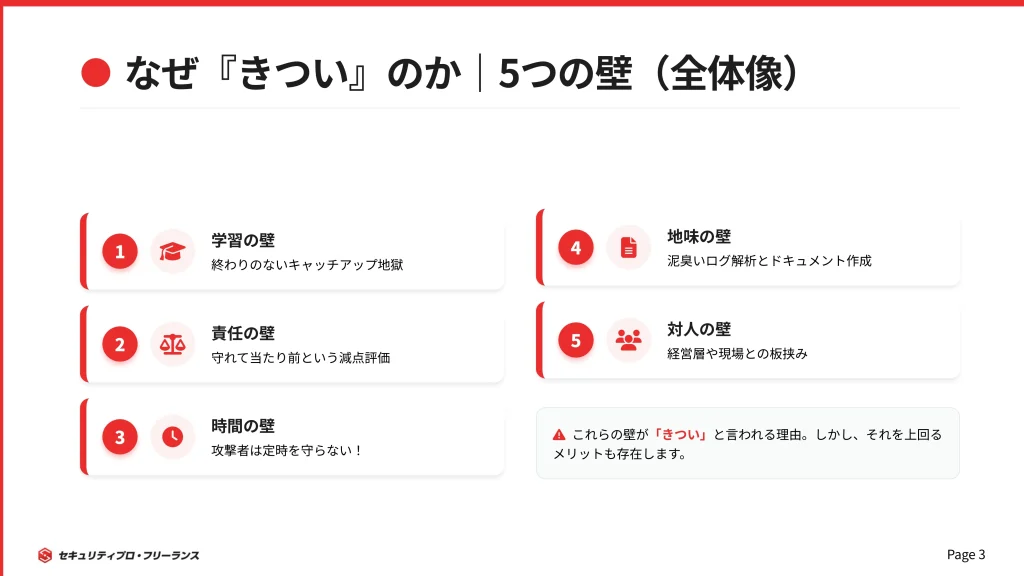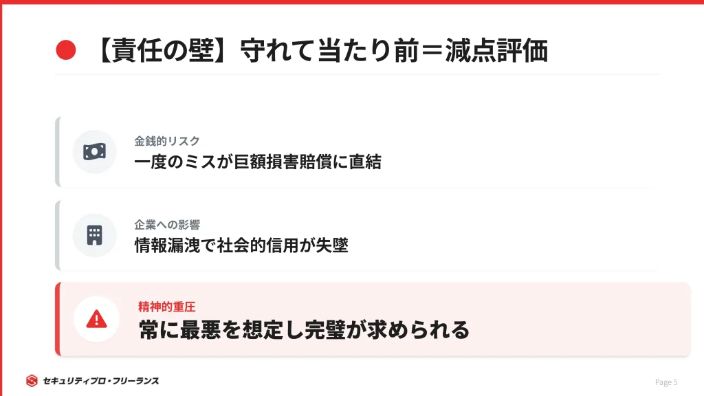 激務やプレッシャーが生まれる構造的な背景については、「「セキュリティエンジニアはやめとけ」は本当?AI時代の将来性とキャリア戦略」でも詳しく取り上げています。