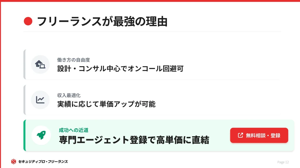 例えば「セキュリティプロ・フリーランス」のような専門サービスに登録すれば、得意分野にマッチした高単価案件に参画できる可能性が高まります。