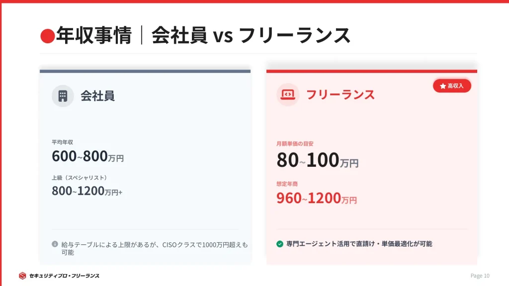 実際、フリーランスのセキュリティエンジニア市場では、月額80万円以上の高単価案件が多数存在します。