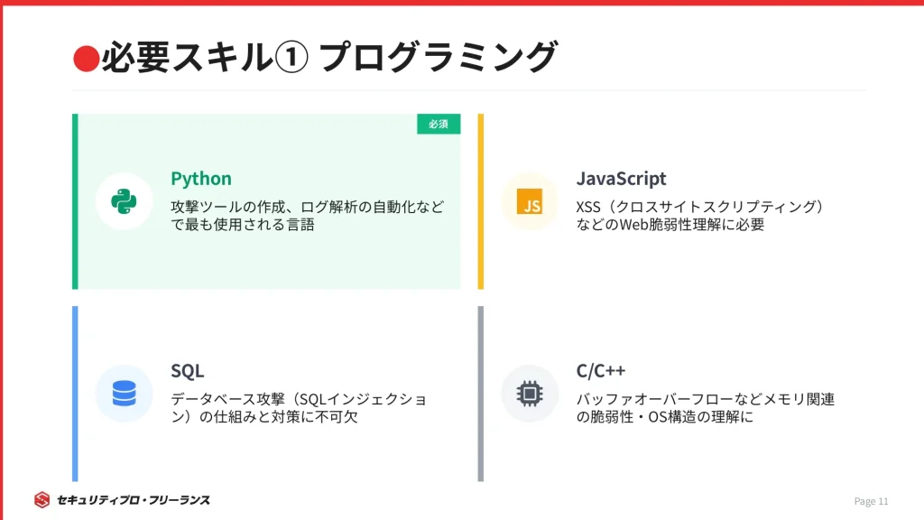 ホワイトハッカーは、攻撃手法を再現したり、解析作業を効率化したりするためにプログラミングスキルが求められます。