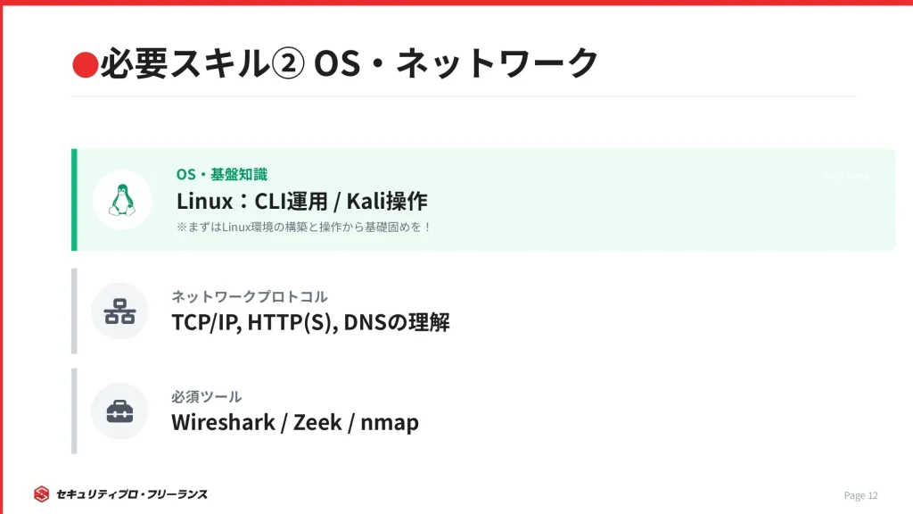 • Linux: 多くのサーバーで使われているほか、ハッキングツールOS「Kali Linux」の操作に必須。コマンドライン操作に慣れること。
