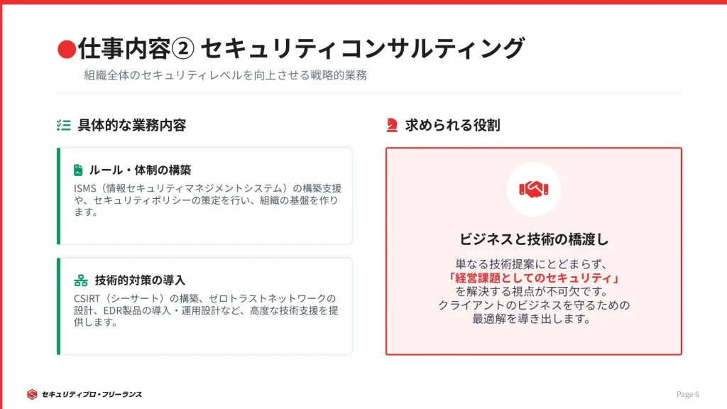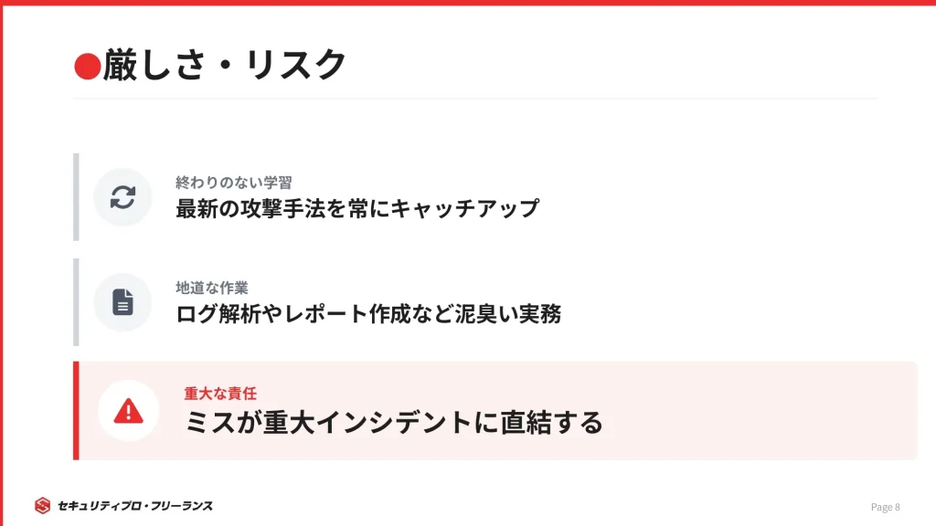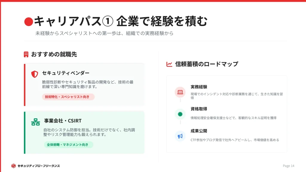 • 基礎的なIT知識に加え、攻撃手法の理解と実践的な資格が武器になる。