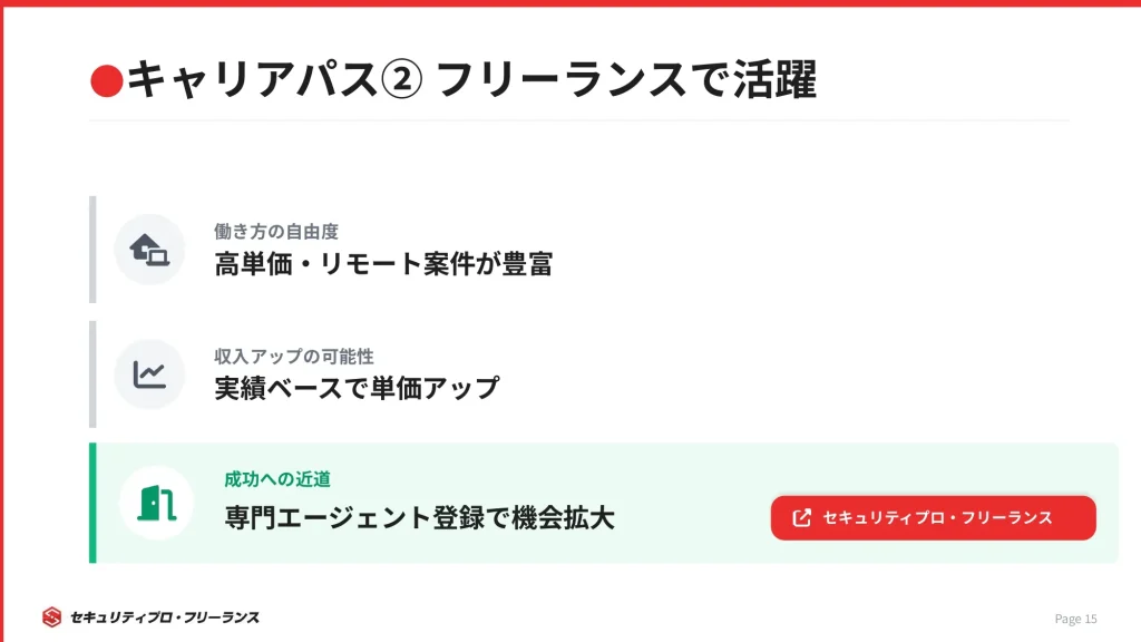 セキュリティプロ・フリーランスのような専門エージェントであれば、あなたの専門性を正しく評価し、高単価な直請け案件を紹介してくれます。
