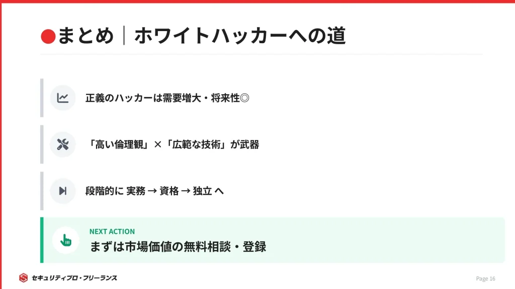 ホワイトハッカーとしてのキャリアを本格的に検討している方は、まずセキュリティ専門エージェントへの無料登録から始めてみてはいかがでしょうか。