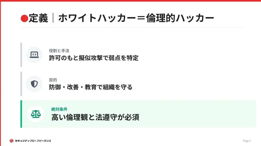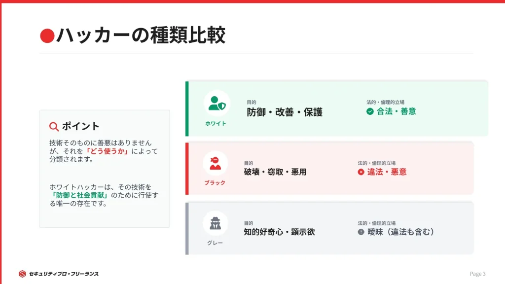 • ホワイトハッカーは合法的にシステムを守る正義の専門家。